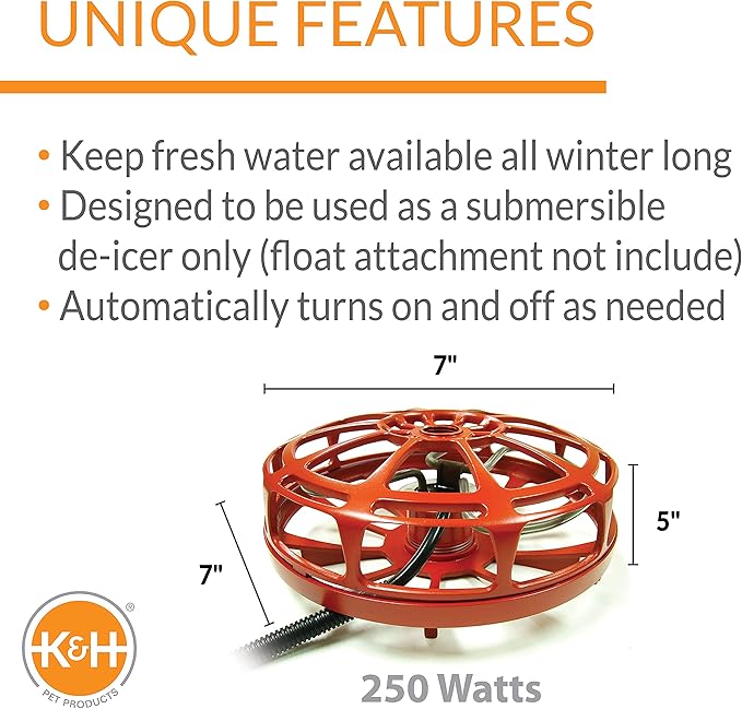- Use: Prevents water from freezing in pails, buckets, and tanks